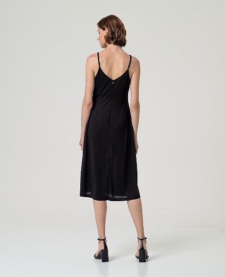 Fijn zacht en stretchy jurkje. Voorzienvan vestelbare spagetti bandjes en split aan de obderzijde. gemaakt van 70% Modal / 30% Polyester. Modal is een zachte, sterke en ademende semi-synthetische vezel gemaakt van cellulose uit beukenhout, vaak omschreven als een verbeterde, duurzamere versie van viscose. Het materiaal voelt zijdezacht aan, neemt goed vocht op, is kleurvast en krimpvrij. Heerlijk te dragen tijdens warme dagen.