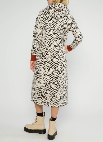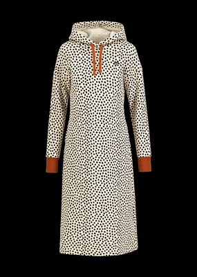Sweatjurk Blaze Babe Urban Dot Vibes. Heerlijke maxi jurk voor koude dagen. Creme met zwarte dot, terra accenten. Deze jurk heeft steekzakken en een capuchon. Warm en Cosy. Gemaakt van een stretch sweatstof. 60% katoen/10% polyester. Te wassen in de macihne op wolwas 30 graden.