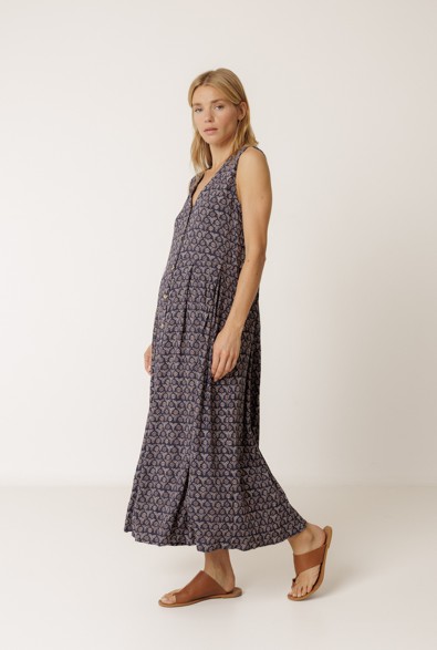 Vestido Marino. Zomerse, doorknoop maxi dress, donkerblauw met fijne print Deze jurk is van onder de borst aangerimpeld, voorzien van steekzakken. De V-hals is zowel aan de voorkant als op je rug te dragen. gemaakt van luchtige soeplvallende non stretch viscose.