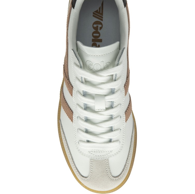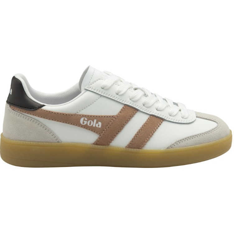 De Viper Leather, een terugkeer uit Gola's designcollectie van 1976, combineert een elegant T-vormig bovenwerk met een veteroogje met zeven vetergaatjes. Deze combinatie resulteert in een perfect geproportioneerde damessneaker in klassieke stijl, afgewerkt met een doorschijnende rubberen zool en subtiele kleuraccenten die een krachtige uitstraling geven. Deze sneaker is hier uitgevoerd in wit met een subtiel accent aan de zijkant en een donkerbruin hielstuk. Het is wederom een ??Gola-model dat je absoluut op je verlanglijstje moet zetten. Sneakers met doorschijnende rubberen zool. Gola-design met klassieke uitstraling. Vetersneakers voor dames. Sneakers voor dames. Witte sneakers voor dames.