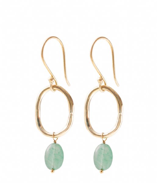 Dit zijn messing vergulde haakoorbellen met een grote ovale ring met een aventurine edelsteen.Heb je extra vertrouwen nodig voor een spannende stap in je leven? Denk aan een nieuwe baan, een ander huis. Aventurijn gaat met je mee. Samen wordt het een begin van iets feestelijks.