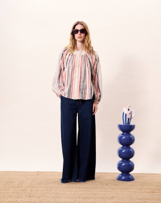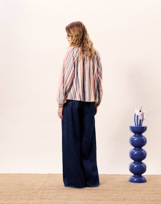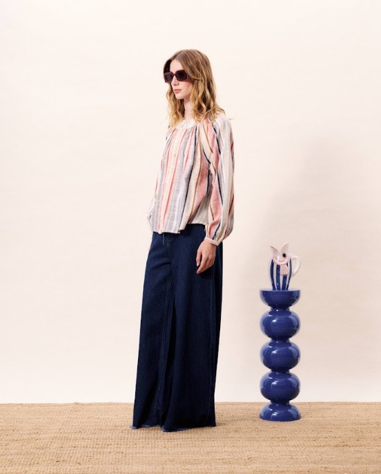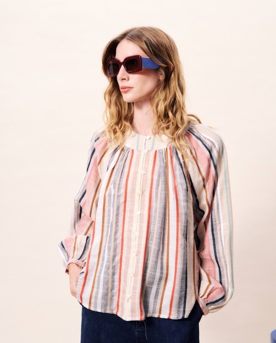 louse met veelkleurige strepen en lange pofmouwen. Losvallende blouse met een ronde halslijn en elastische taillebandLange pofmouwen met plooien aan de manchetten. Knoopsluiting aan de voorkant. Meerkleurig verticaal streepmotief. Soepele en lichte stof. Non Stretch 60% katoen 40% viscose. Wij adviseren 1 maatje kleiner te kiezen.