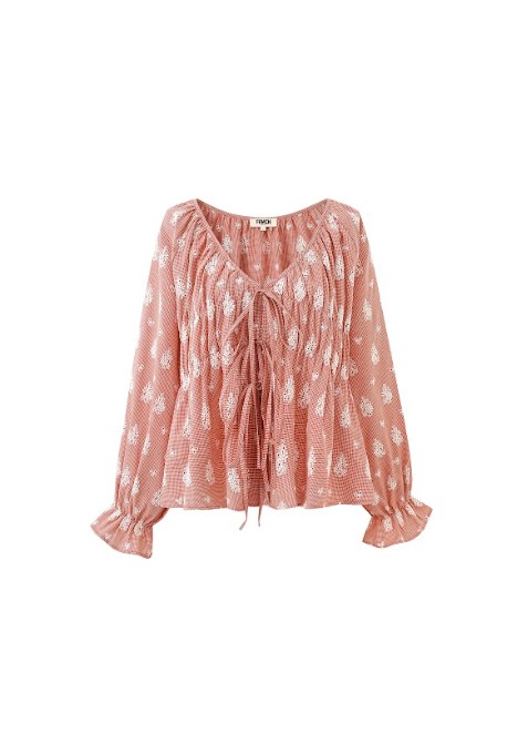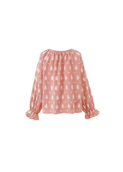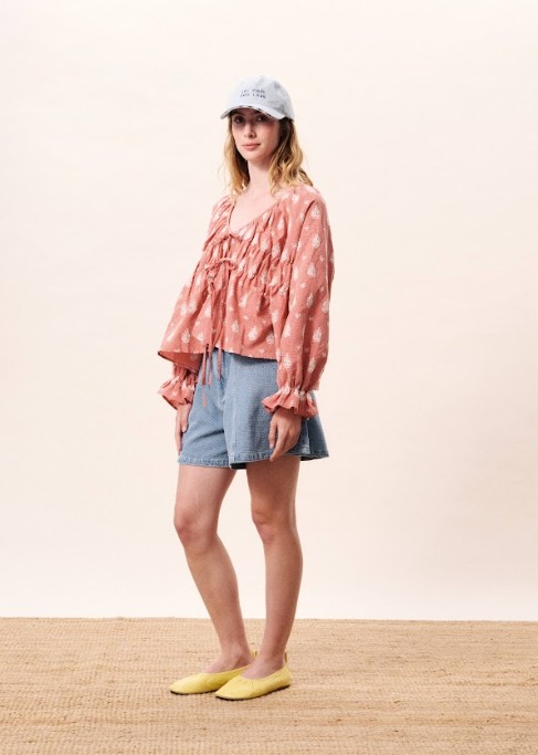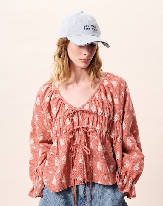 Blouse van bedrukte voile met witte bloemenmotieven op een terracotta achtergrond en een halslijn met trekkoord. Soepelvallende blouse met een ronde halslijn met elastiek. Lange, pofmouwen met geplooide manchetten. Verstelbare halslijn met trekkoord. Witte bloemenprint op een terracotta basis. Semi-transparante voile stof. 100% katoen. Wij adviseren 1 maatje kleiner te kiezen. Gemaakt van non stretch katoen.