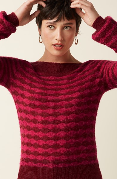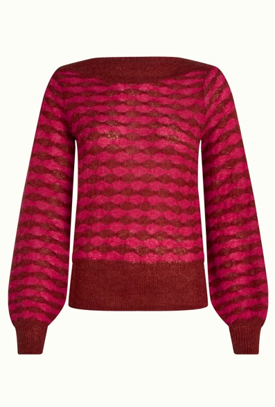 Erin Bell Top Bodega Rio Red. De Erin Bell Top Bodega is gemaakt van een delicate ajourbreisel met stretch en versierd met een verfijnd grafisch patroon. De top heeft lange mouwen, elegante manchetten en een sierlijke boothals, en combineert tijdloze verfijning met draagcomfort. Boothals. Lange mouwen met manchetten. Ajour Motief.Grafisch patroon. Ons model is 1,70 m en draagt maat: S. Samenstelling stof: 45% acryl, 30% nylon, 15% wol, 10% alpaca.